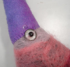 We then took lumps of "wool tops" and needle punched them into the felt in whatever pattern we chose.  I picked a load of wool tops in a pinky purple colour-way, and punched them in in stripes, adding squares of silver organza ribbon for patches of sparkle, and a twisted strip of blue for a curly wing effect.
