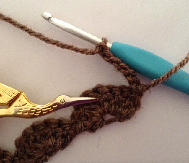 - Repeat all the way along until you come to the last chain space. You need to SS into the 3rd chain of this chain as shown by the scissors.