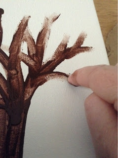 Dip your finger in the brown paint and draw the tree trunk and branches. The smudges your finger makes creates lovely branches.